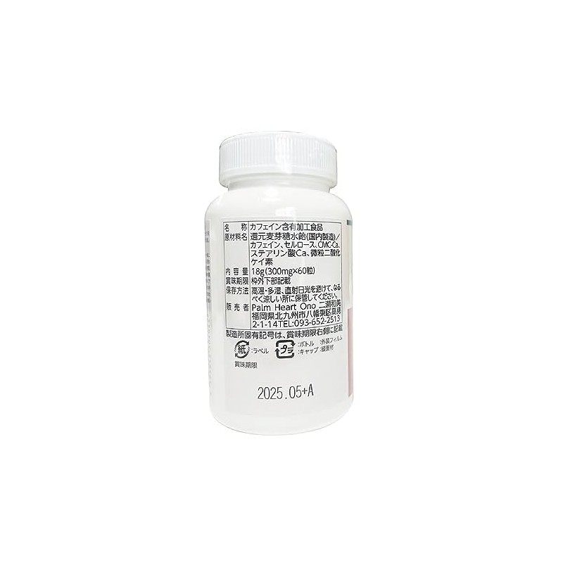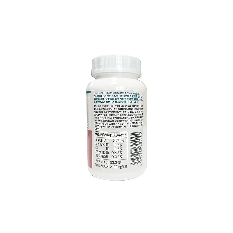 - 1粒(カフェイン100mg)~2粒(カフェイン200mg)と、ご自身で調整していただけます。1本60粒入り:約1~2ケ月分 ※成分のみに特化した食品としてのサプリメントです。医薬品成分は含まれていません。製品の用法を守り、適量の飲用をお願いいたします。 ・衛生的なシュリンク包装です。