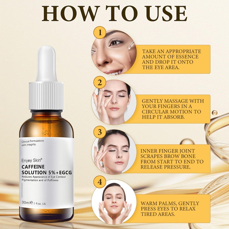 - Caffeine essence: you will receive a 30 ml bottle of caffeine essence, which contains 5% caffeine and rich in EGCG. It can effectively reduce dark circles and puffiness, improve skin firmness, fade fine lines and wrinkles and add vitality to your daily skin care.