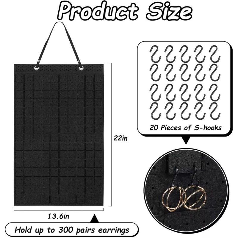 HANGING EARRING ORGANIZER: Quantity: 1 pack earring holder with 20 pieces of hooks Size: approx. 22 x 13.6 inches Material: natural felt Color: black color Shape: rectangle Package Includes: - 1 pack of hanging jewelry organizer (Jewelry Not Included) Note: The product received may be slightly bent due to shipping, it can be restored by folding it in reverse. (Jewelry Not Included)