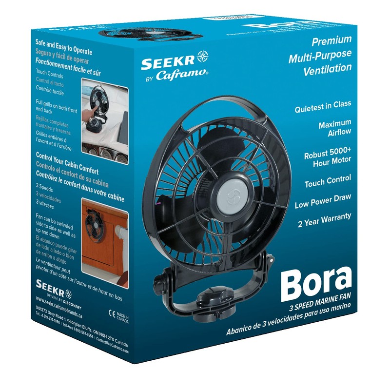 Caframo Bora. 12V Marine Fan. Direct Wire, Low Draw, 5000 Hour Motor Life. Black, 6.5” x 3.0” x 9.5”