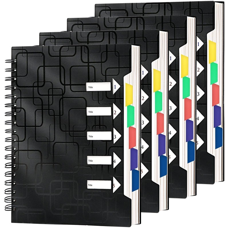 - NOTEBOOK WITH TABS: Set of 4 spiral notebooks are designed with 5 writable tabs and 5 color page dividers. It helps quickly mark your work projects and easily flip between subjects. Improve note taking efficiency and make being organized fun! If you have multi tasks or work to record, 5 subject notebooks are excellent choice.