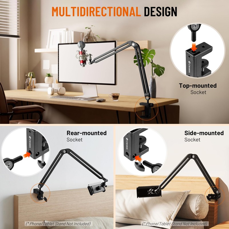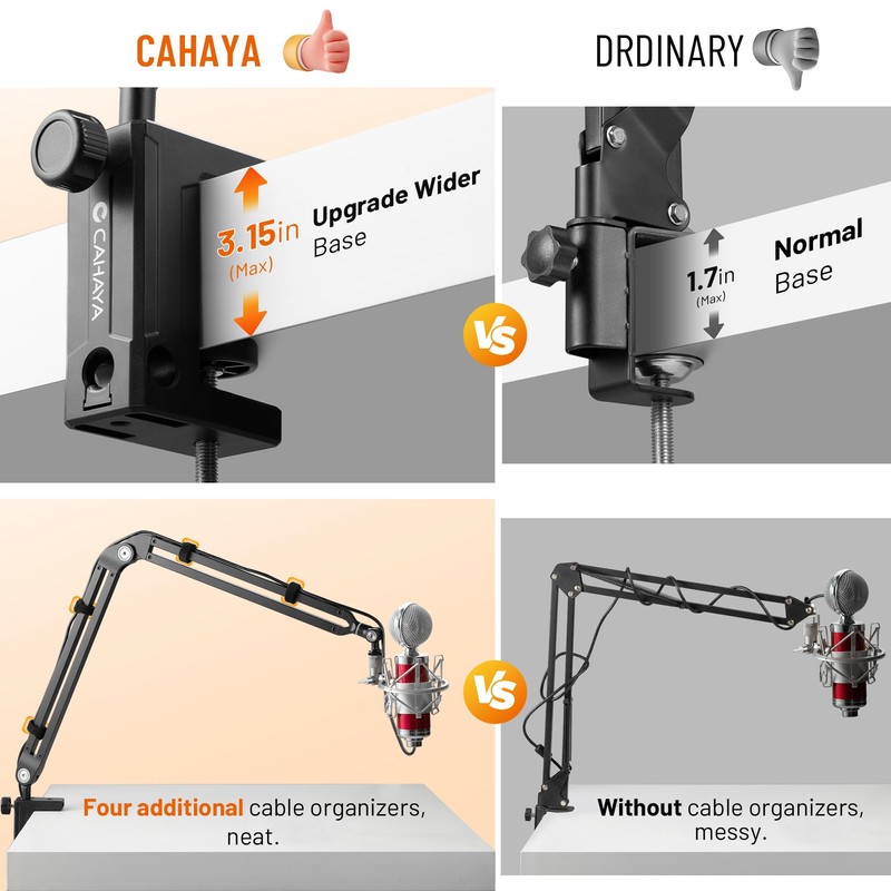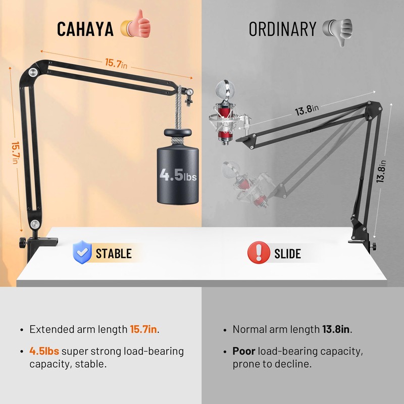 - 360-Degree Free Adjustment Design: CAHAYA boom arm microphone stand features a fully adjustable design with 4 mounting holes on the clamping base, allowing you to freely choose the position for mounting the boom arm. The boom arm can also be adjusted 360 degrees without the need for cumbersome knobs, making it convenient and easy to use.