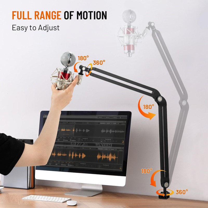 - Flexible Application for Various Settings: Suitable for various scenarios such as live streaming, podcasting, and more, the boom arm stand can be installed in almost any location and any surface with thickness doesn't exceed 3.15 inches. Whether sitting comfortably in a chair, or recording while standing, it can easily meet your recording needs. Additionally, it is also suitable for use in work meetings, gaming, and other scenarios, offering excellent versatility.