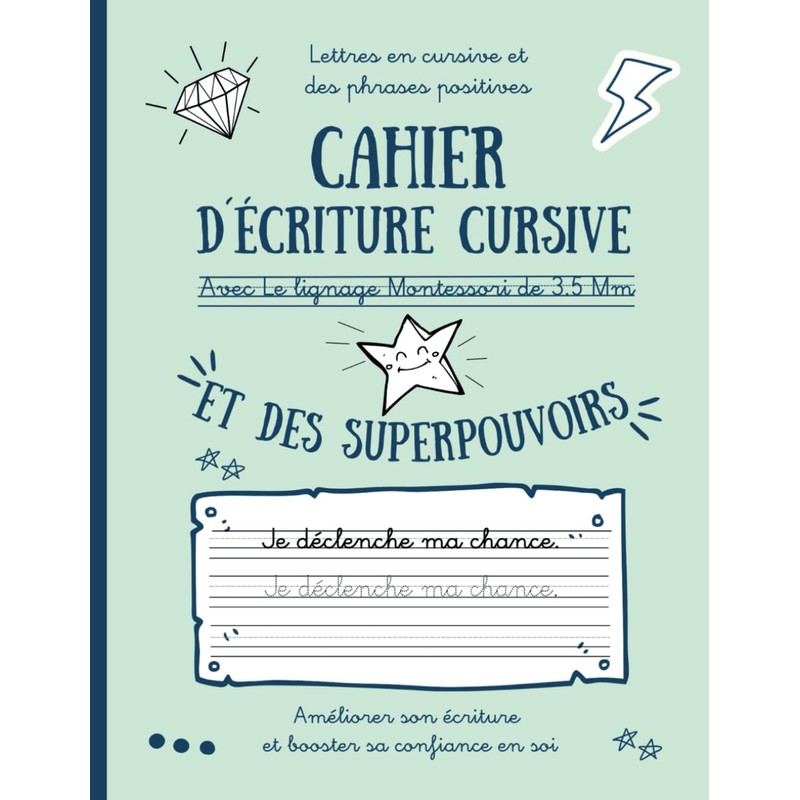 Cahier d´écriture Cursive Avec Le Lignage Montessori de 3.5 Mm et des Superpouvoirs :: Pour apprendre à écrire correctement en attaché, améliorer son écriture et l´estime de soi chez l´enfant avec des phrases positives - Pour les enfants de 6 à 12 ans.