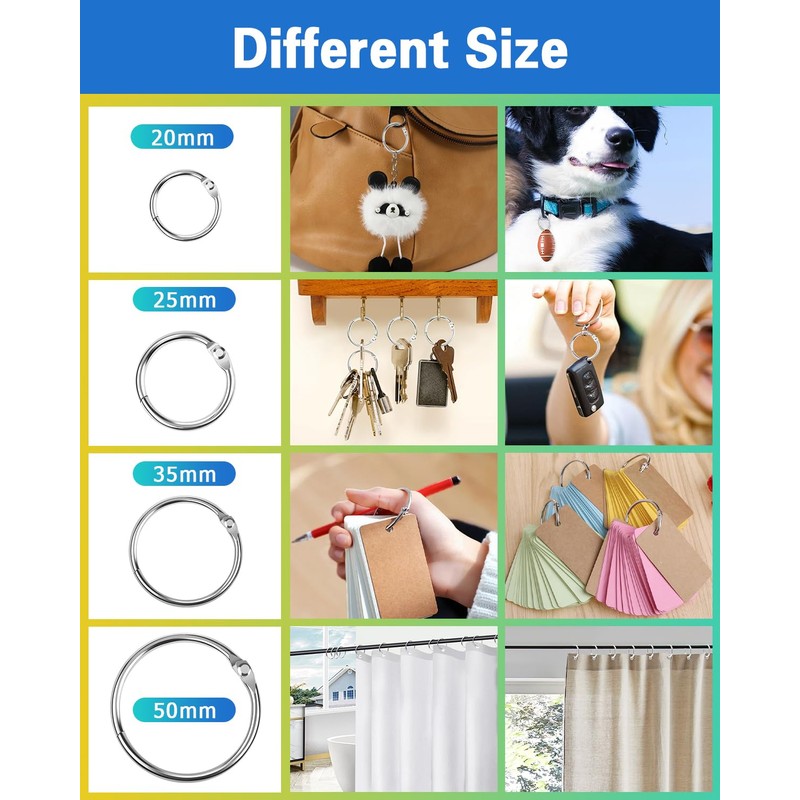 - Book ring set: you will receive 40 pieces ring binding in 4 sizes (20 mm, 25 mm, 30 mm, 50 mm), which meet your daily requirements for making index cards, key rings, crafts, etc.