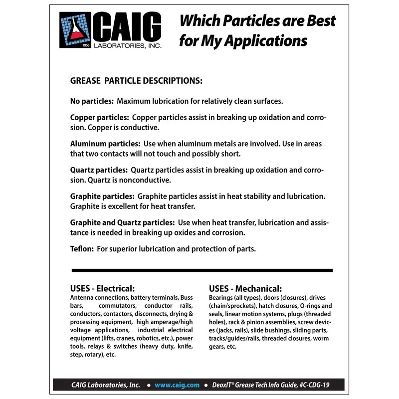 - USES – ELECTRICAL & MECHANICAL: Antennas, battery terminals, Bearings, Buss bars, chain/sprockets, commutators, conductor rails, conductors, contactors, disconnects, doors/closures, drying & processing equipment, hatch closures, high amperage/high voltage, lifts, cranes, rack & pinion, robotics, power tools, relays & switches, slide bushings, O-rings/seals, worm gears, etc.