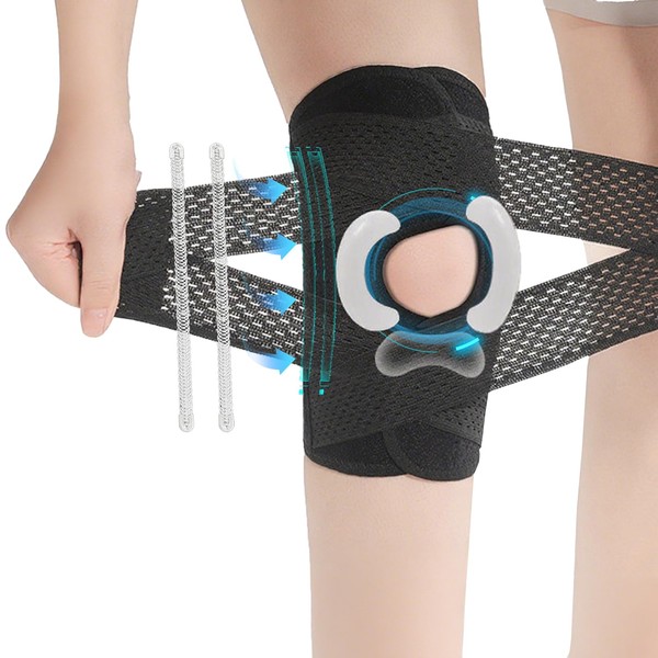 CAIJ Black Professional Knee Support with Patella Gel Pad and Side Spring Stabilizer, Adjustable Knee Support for Meniscus Tear Knee Pain, Compression Knee Support