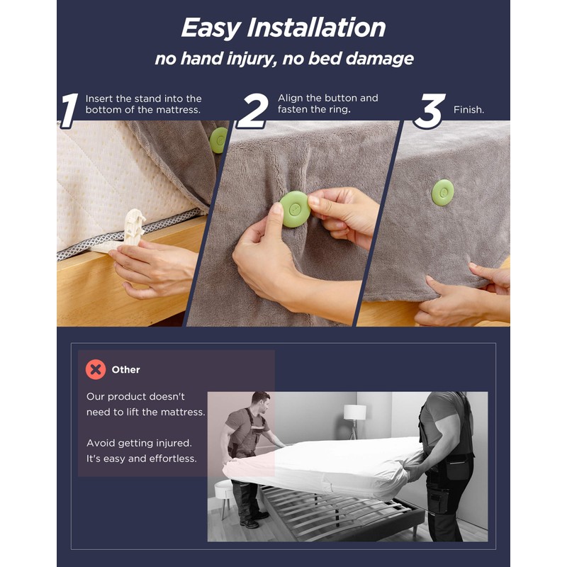 - Super - Easy, Injury - Free Installation - Thoughtfully designed for ease, our sheet holders are a breeze to install. No need to lift the mattress. Just slide them under corners. It's safe, stress - free, and won't harm your mattress or sheets.