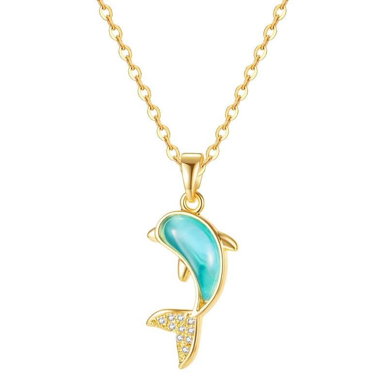 Caimeytie Green Dolphin Pendant Necklace for Women Girls with Gold Plated Stainless Steel Chain, Stainless steel, copper, Cubic Zirconia