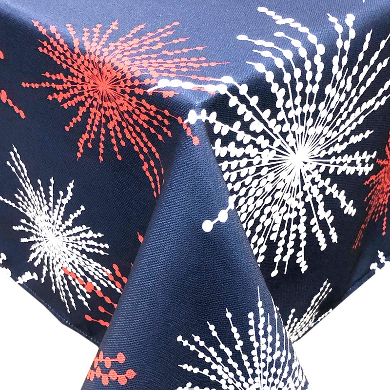 - Red White Blue artistic fireworks icon printed fabric tablecloth. Two background color options available.