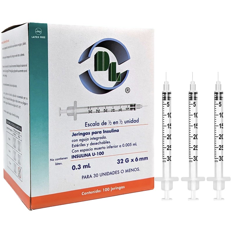 - Caja con 100 Jeringa Unibody DL para insulina de 0.3 ml con aguja 31G X 6mm