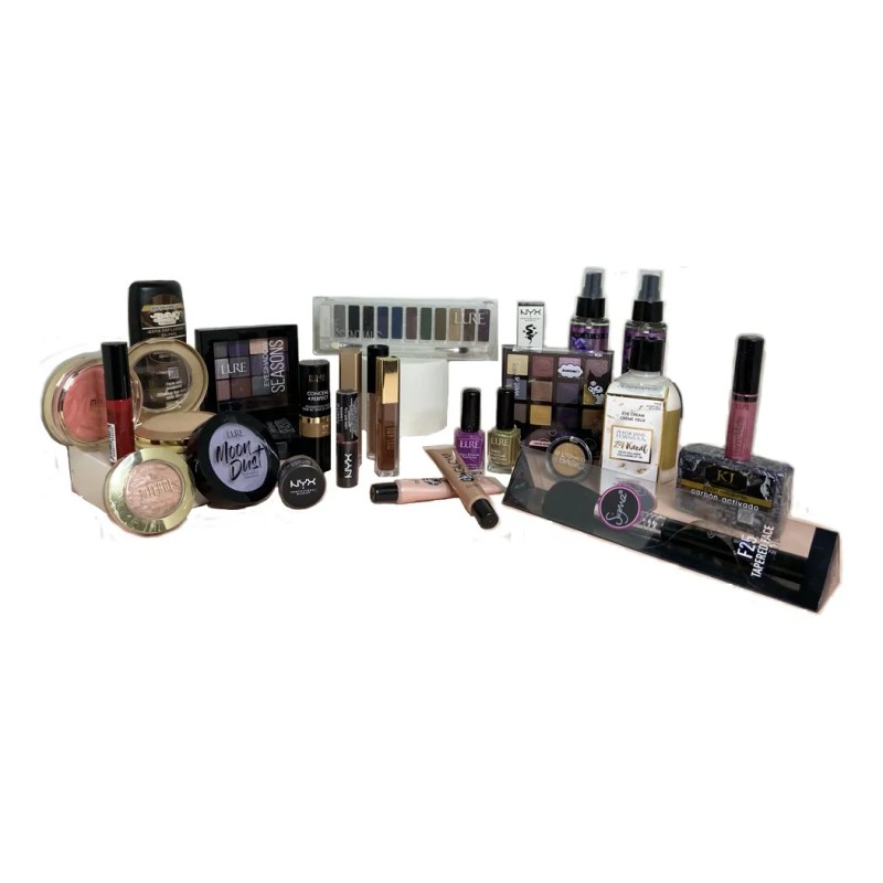 Caja sorpresa ideal para ventas a mayoreo. Incluye más de 35 productos entre cosméticos y accesorios.