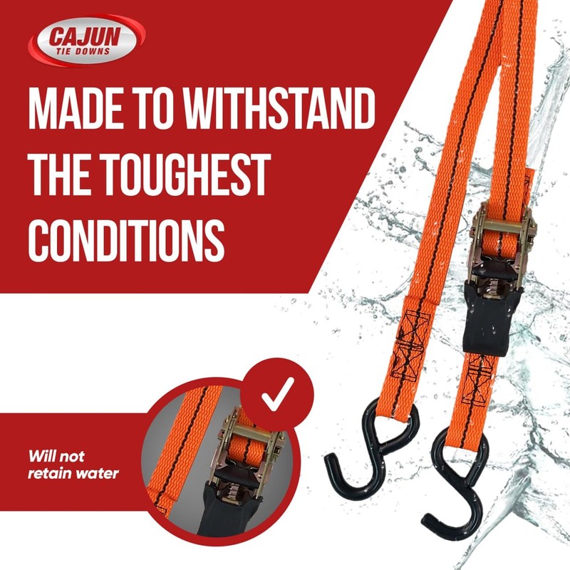 - Take your water adventures to the next level with Cajun Tie Downs 3-Point Tie Down Ratchet Strap. Trust in our exceptional craftsmanship and engineering.