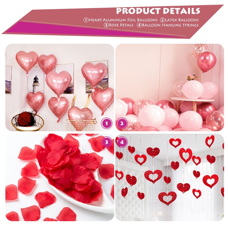 - 💓 [ VALUE PAKE ] - Our valentines balloons kit includes 50pcs pink latex balloons, 25pcs metallic red latex balloons, 10pcs red confetti Balloons, 8pcs foil heart balloons, 1 set of I LOVE YOU balloons, 50pcs balloon hanging strings, 200pcs artificial rose petals, 1pcs balloon tie tool and 1 roll of balloon dot glue. Sufficient quantity and various styles can satisfy your decorative demands!