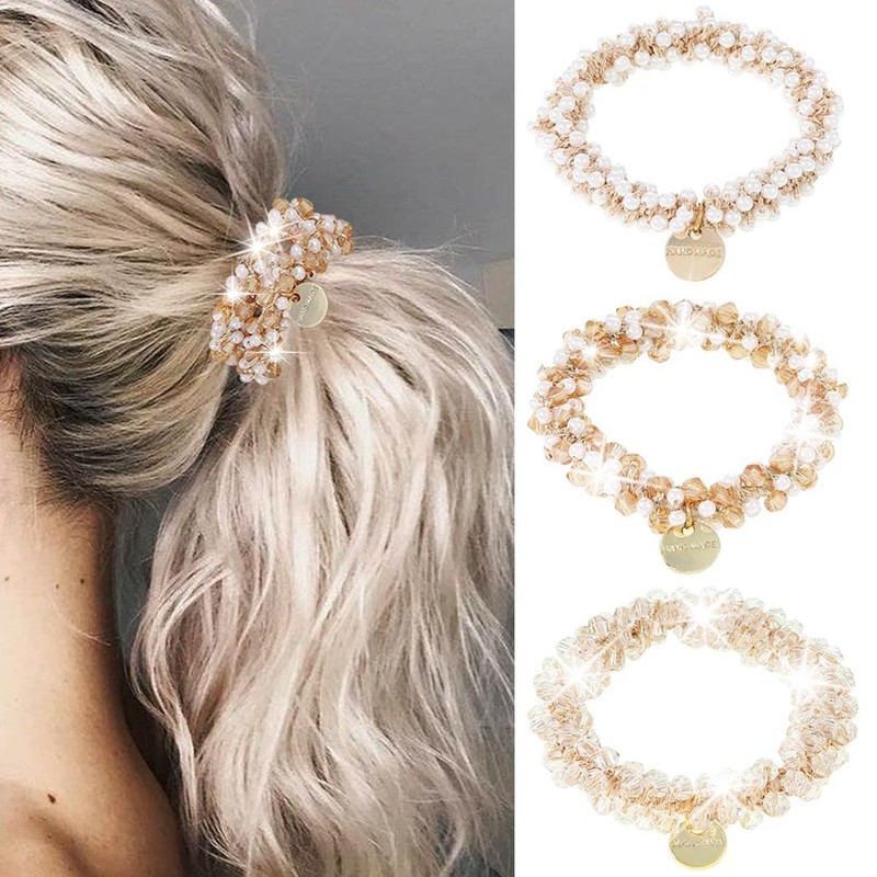 - Rhinestone hair ties are made of high flexibility hair band and artificial pearls, it will make you look more attractive and beatiful. Hair rope is soft, thick, stretchy, sturdy. And it won't snag or damage your hair.