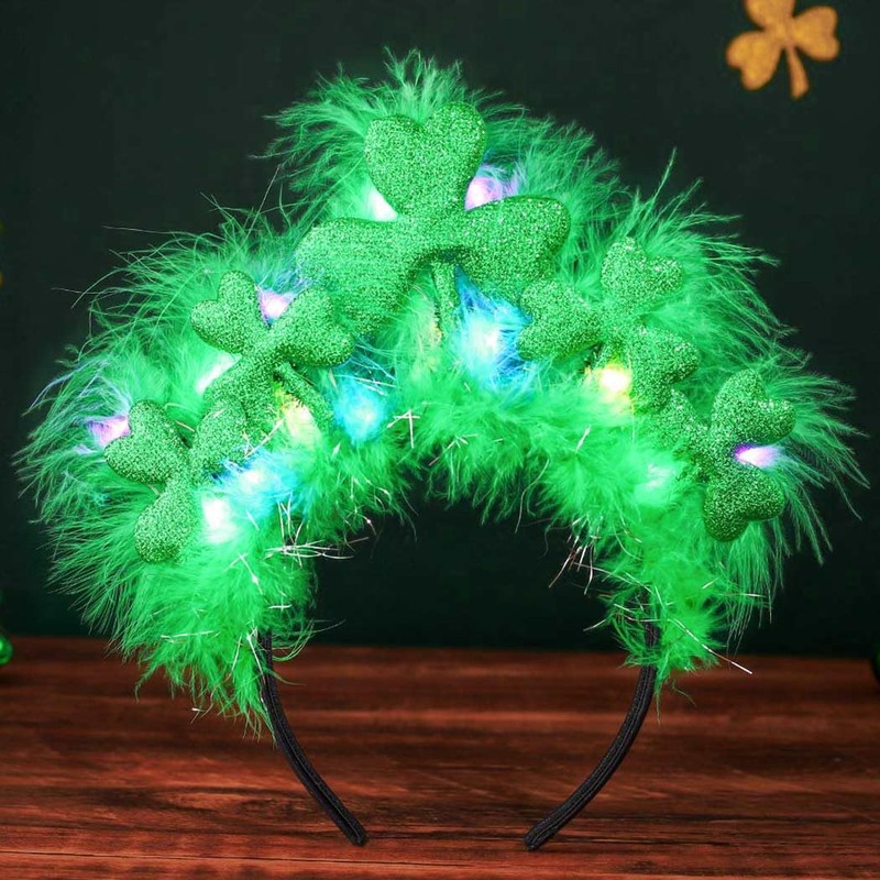 - Led green headbands are made of glitter shamrock and soft feather, with led light, well made and won't broken.