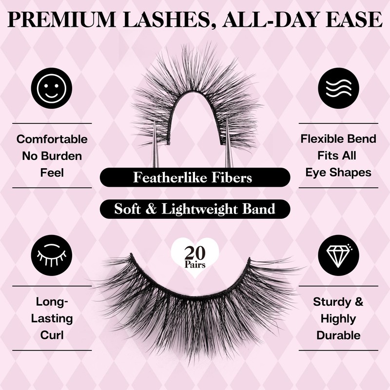 - [Reusable for 6+ Months] -- The durable fake eyelashes resist shedding and maintain a long-lasting curl for reliable wear. Each pair is reusable 10+ times with proper care. With 20 pairs per box, enjoy beautiful strip lashes for 6+ months - an excellent value choice.