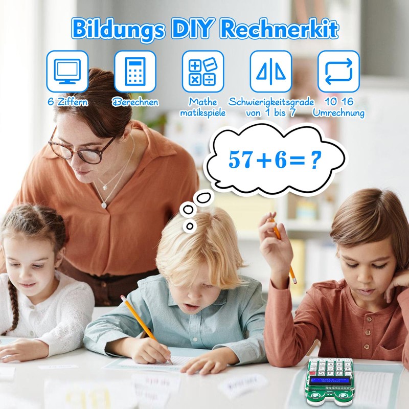 - DIY calculator kit: solder a 6-digit desktop calculator yourself. This DIY kit processes basic addition, subtraction, multiplication, division and converts between decimal and hexadecimal numbers. With the clear 1602 screen and large buttons for easy operation, this soldering practice kit is a good support when learning and working!