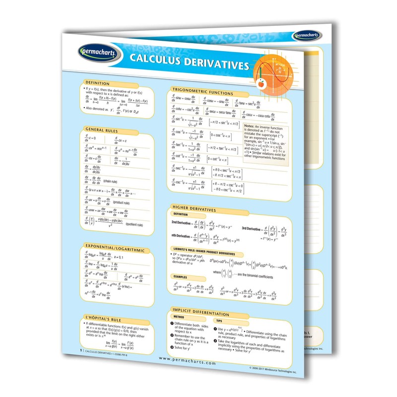 • This advanced 8.5" x 11" laminated 4-page Calculus quick reference Guide provides assistance to the user through its articulation of key Derivatives principles.