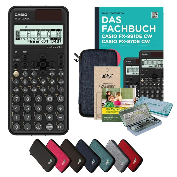 - Contents: Casio FX-991DE CW, WYNGS protective case blue, WYNGS screen protector, CALCUSO technical book, learning CD, premium geometry set.