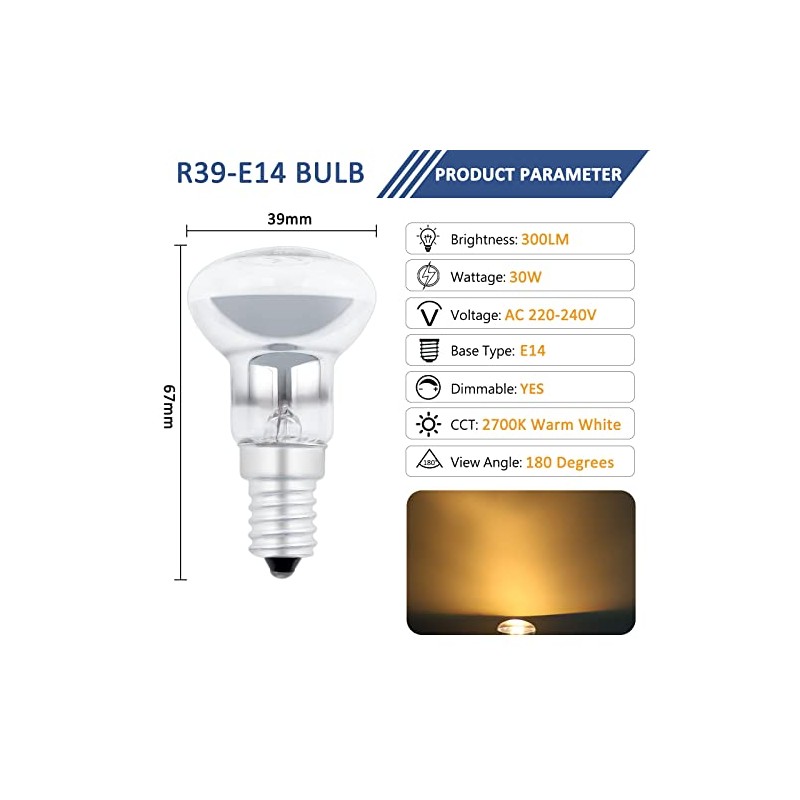 - Gr??e?39x67mm. R39 E14 30W Reflektorglhlampe, 300lm, 180 Abstrahlwinkel. Spiegelklares Glas an der Unterseite, das W?rme erzeugen kann, um die Lavalampe gleichm??ig zu erhitzen. Bitte best?tigen sie vor dem kauf die gr??e, die fr Ihre leuchte geeignet ist.