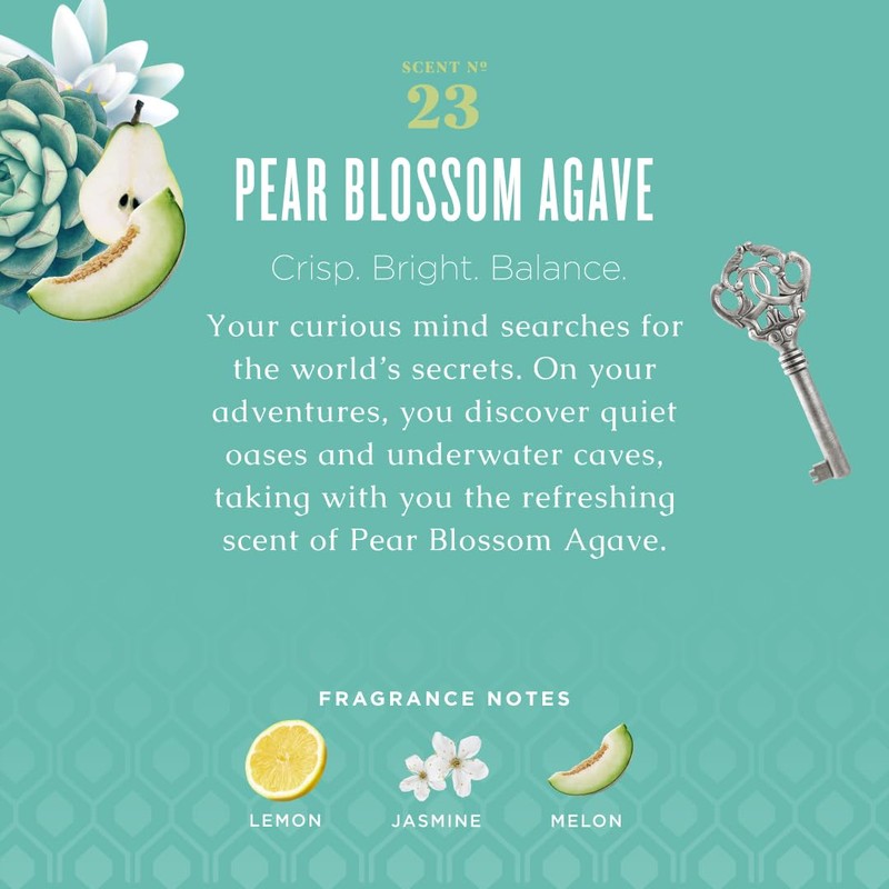 - Your curious mind searches for the world's secrets. On your adventures, you discover quiet oases and underwater caves, taking with you the refreshing scent of Pear Blossom Agave.