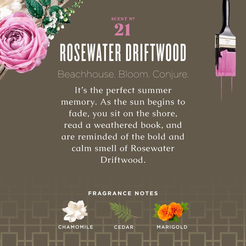 - It's the perfect summer memory. As the sun begins to fade, you sit on the shore, read a weathered book, and are reminded of the bold and calm smell of Rosewater Driftwood.