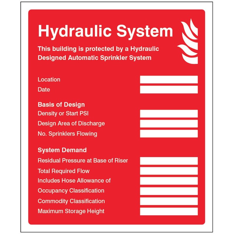 Caledonia Signs 11452H Hydraulic sprinkler system ID plate sign