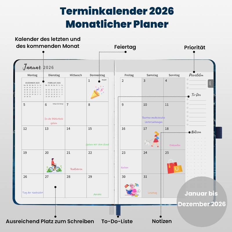- Design and function combined - with pen holder, 2 ribbons, bag and donkey ears - the 2026 diary with premium feel.