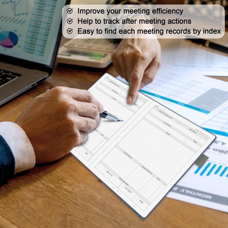 - PREMIUM PAPER & POPULAR PERFECT SIZE - This meeting planner use 100gsm paper that is ink resistant makes it without fear of ink penetration. The Meeting notebook is B5, measuring 7x10 inches. Which has large enough writing room to help you plan and organize your agenda.