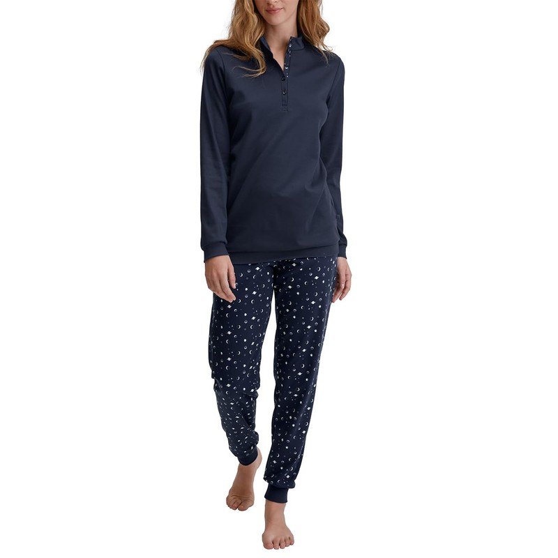 CALIDA Midnight Dreams Women's 100% Organic Cotton Warm Quality Cuffed Pyjamas, Peacoat Blue