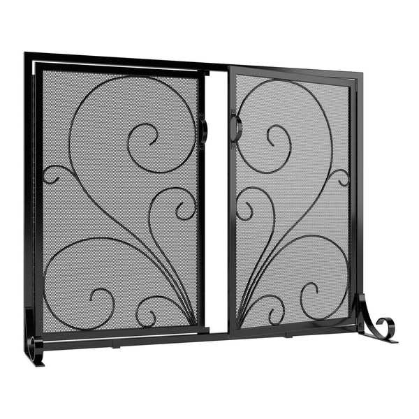 Calidola Flat Fireplace Screen with Doors,Solid Wrought Iron Frame with Metal Mesh, Flat Panel Decorative Fireplace Screen with Scroll Design, Free Standing Spark Guard