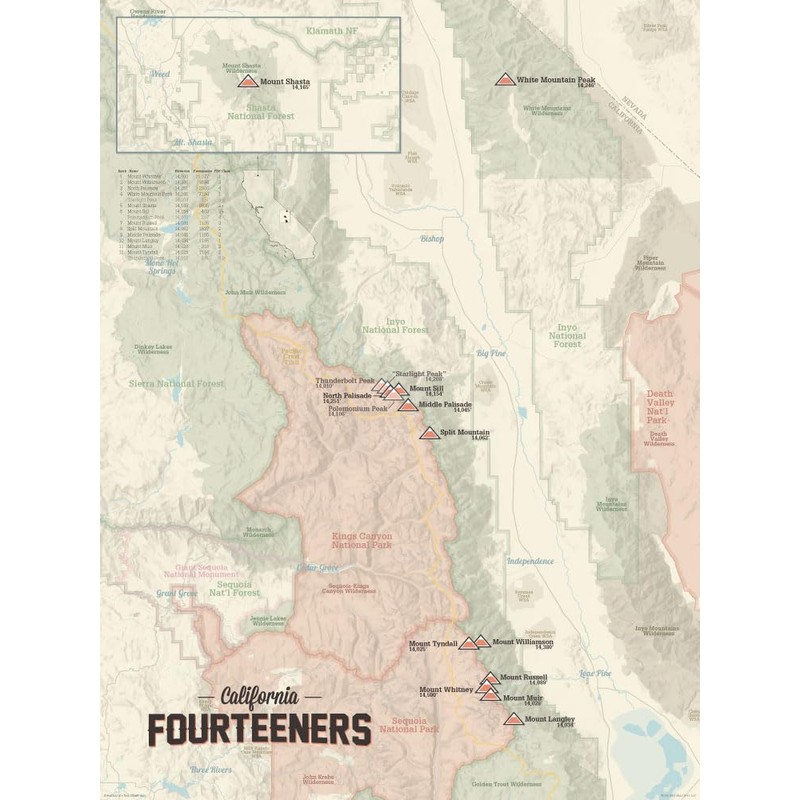 California 14ers Checklist Map 18x24 Poster (Tan)