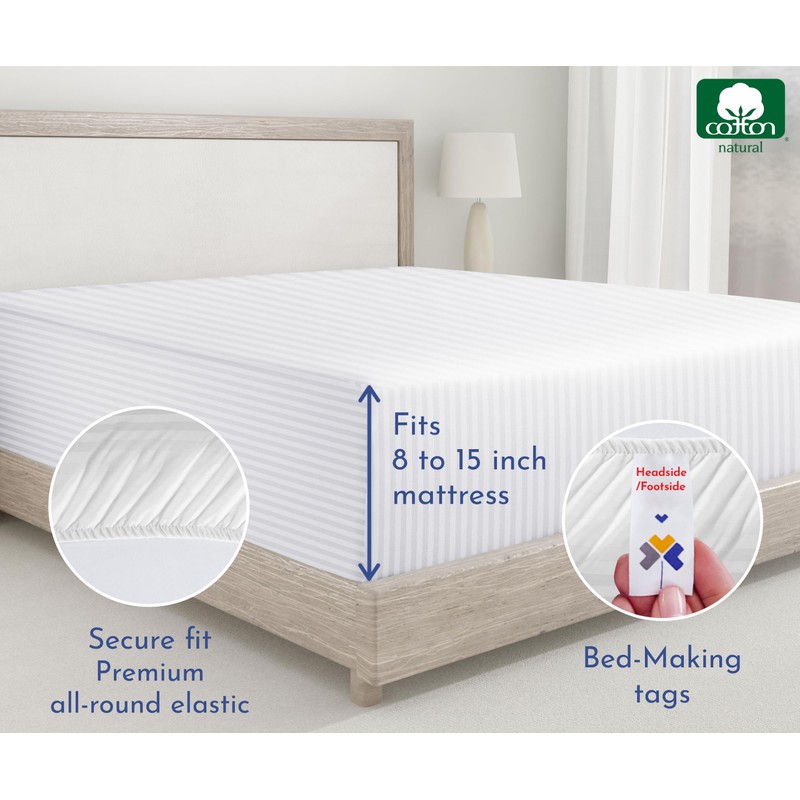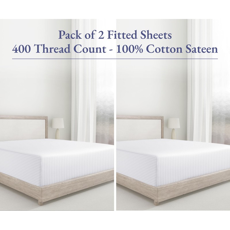 • BRIGHT WHITE WITH ELEGANT SUBTLE STRIPES: Crafted from luxurious 400 thread count cotton sateen, these fitted sheets feature pure bright white fabric accented with subtle tone-on-tone stripes that alternate between a soft matte and elegant sheen. No gray or color striping — just a timeless hotel-style design. Please note: Stripe visibility varies under different lighting for a refined look.
