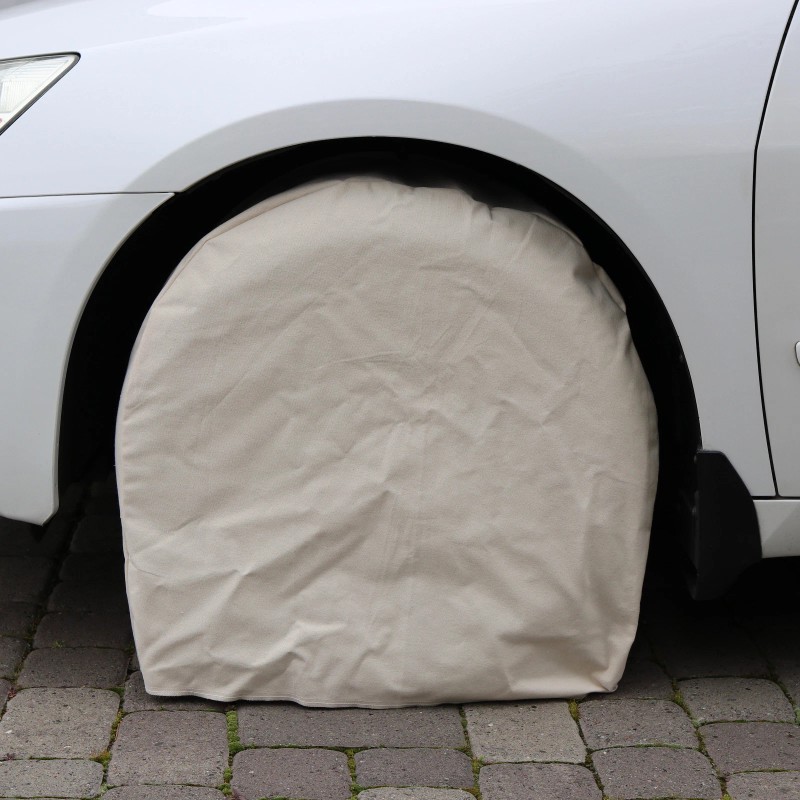 Keep your tires and wheels clean and protected with these cotton tire covers. These tire covers are an easy way to protect your tires from fading and dry rot, plus keeps the sun off of your wheels to prevent damage to their finish as well. Made of durable cotton canvas, these covers feature stitched seams a steel spring tension rod to secure the tire covers in place. The set includes 4 tire covers. Each tire cover is constructed of durable cotton canvas in an off white finish. These tire covers are unlined.