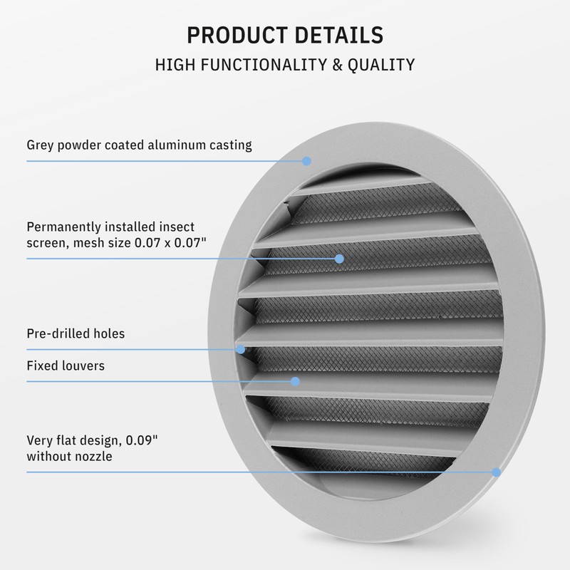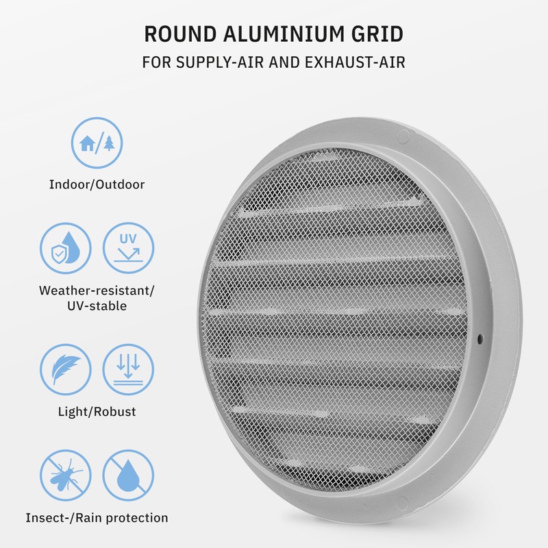 - Our louvered vent cover impresses with its first-class functionality. It has a high air flow rate and can be used as a supply air and exhaust air grille. It offers reliable insect protection thanks to a fine-meshed, permanently installed insect screen (2x2mm). Our grille is compatible with all standard round ventilation ducts and flex ducts in accordance with DIN EN 1506.