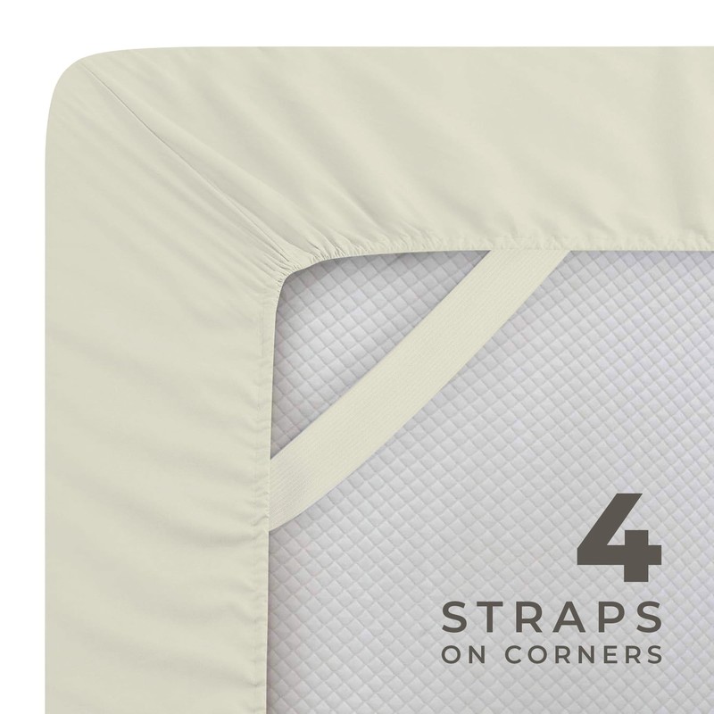• ALL-AROUND ELASTIC/ ADDED STRAP TO FOUR CORNERS: The fitted sheet features all-around elastic, ensuring a snug fit on the mattress and providing a polished look to your bed. Additionally, we have added straps to the four corners of the sheets to secure them and minimize any unwanted movement.