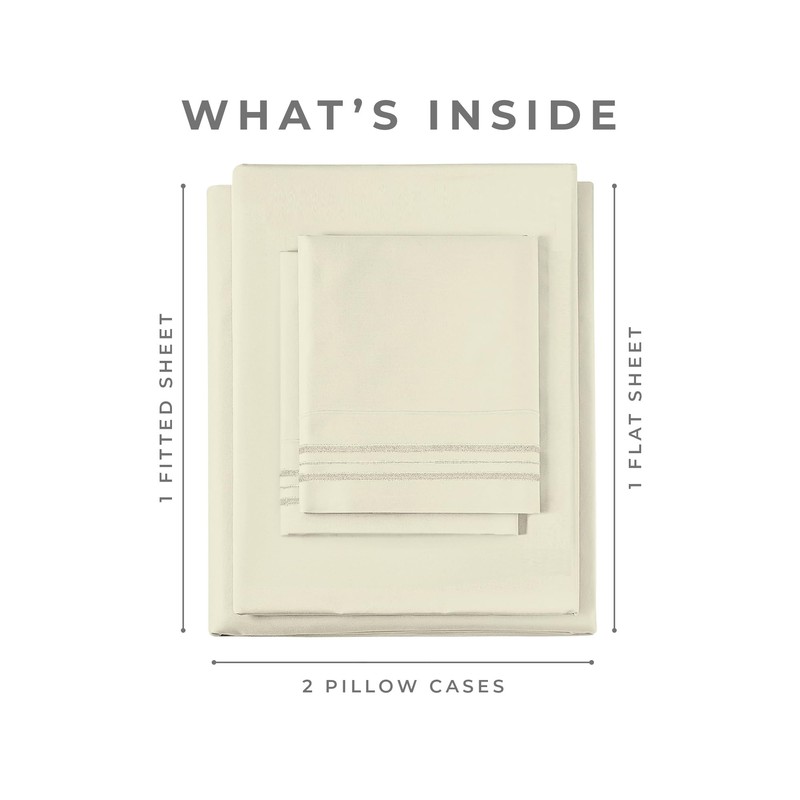 • INTRODUCING OUR EXCLUSIVE 4-PIECE BED SHEET SET, designed to elevate your sleep experience. This luxurious set includes two pillow cases, a flat sheet, and a fitted sheet. The flat sheet boasts generous dimensions of 96 inches by 66 inches, ensuring ample coverage for your bed. Our fitted sheet measures 75 inches by 39 inches, perfectly tailored to fit your mattress with precision. To complete the ensemble, we provide 2 exquisitely embroidered pillowcases measuring 20 inches by 30 inches