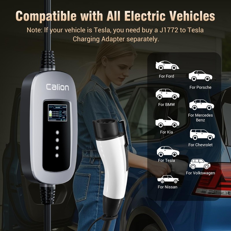 - Portable Design: This portable ev charger design is simple and easy to use, It features a 16.5 FT charging cable and a NEMA 14-50 plug, suitable for various scenarios. It is compatible with all electric vehicles equipped with the J1772 connector. Note that an adapter is required for Tesla models using the J1772 version