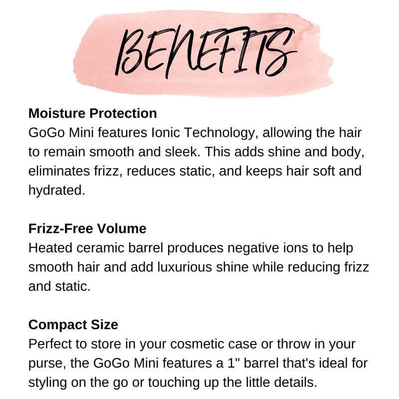 - The heated ceramic barrel produces negative ions to help smooth hair and add luxurious shine while reducing frizz and static. Perfect to store in your cosmetic case or throw in your purse, the GoGo Mini features a 1" barrel that's ideal for styling on the go or touching up the little details.