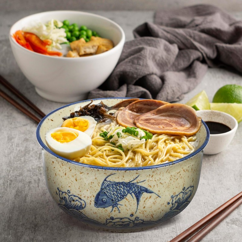 - Ceramic Ramen Bowls Set: Includes 2 26oz ramen bowls + 2 bowl lids + 2 ceramic spoons + 2 chopsticks - Everything for authentic Japanese/Korean/Vietnamese noodle experience