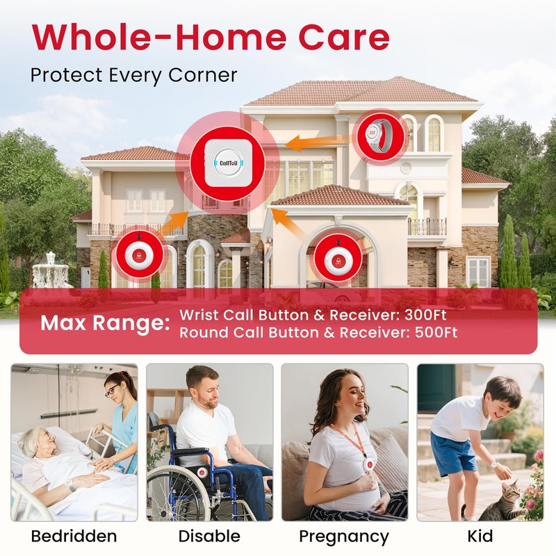 - [ Wireless Guard ] 2 Receivers 1 Call Button 1 Watch Transmitter. Allow caregivers and residents to be free while ensuring that help is still available at the touch of a button, ideal for elderly, seniors, patients, disabled