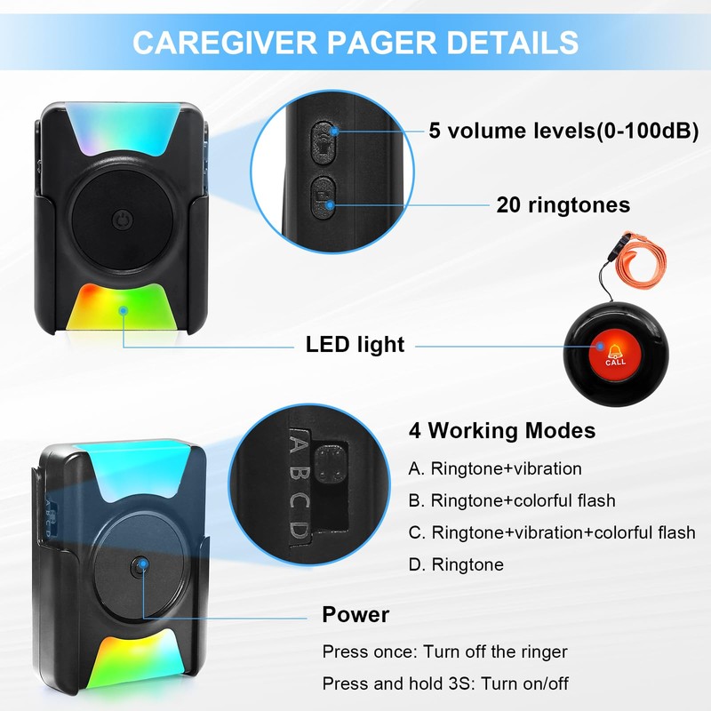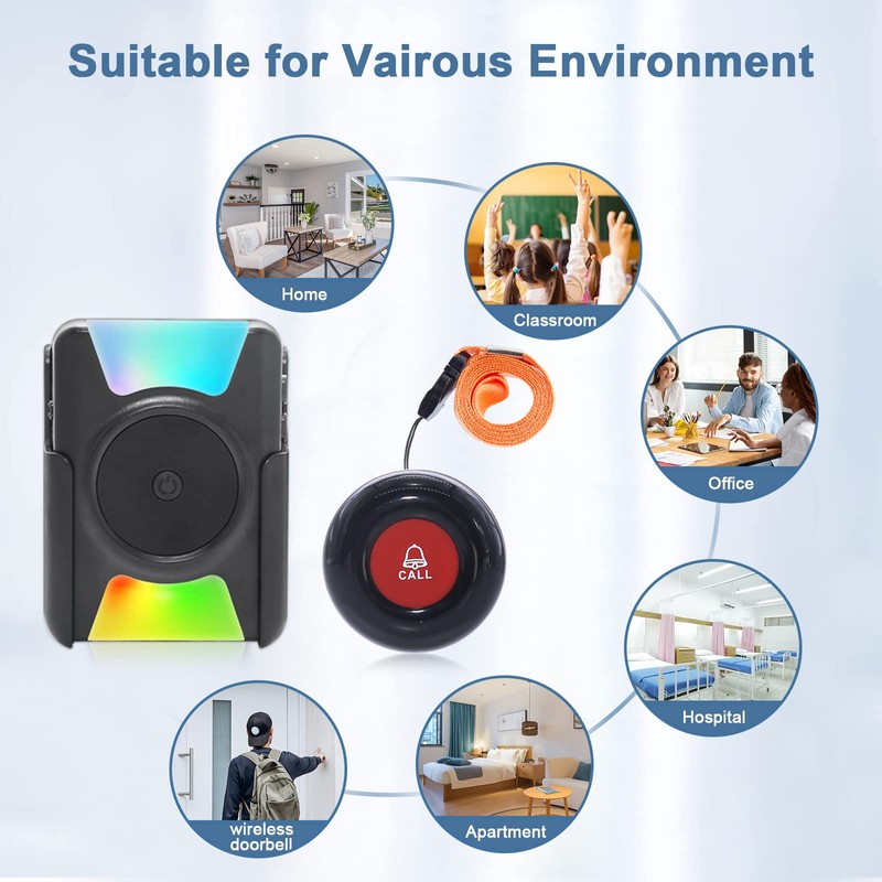 - 【Smart Caregiver Pager】 This caregiver call bell will remember your customized settings and has sleek, LED notification for hearing impaired to easily spot at night, receiver with 21 kinds of ringtones and 5 adjustable volume levels, IP55 waterproof call button will operate between temperatures of -4F to 140F