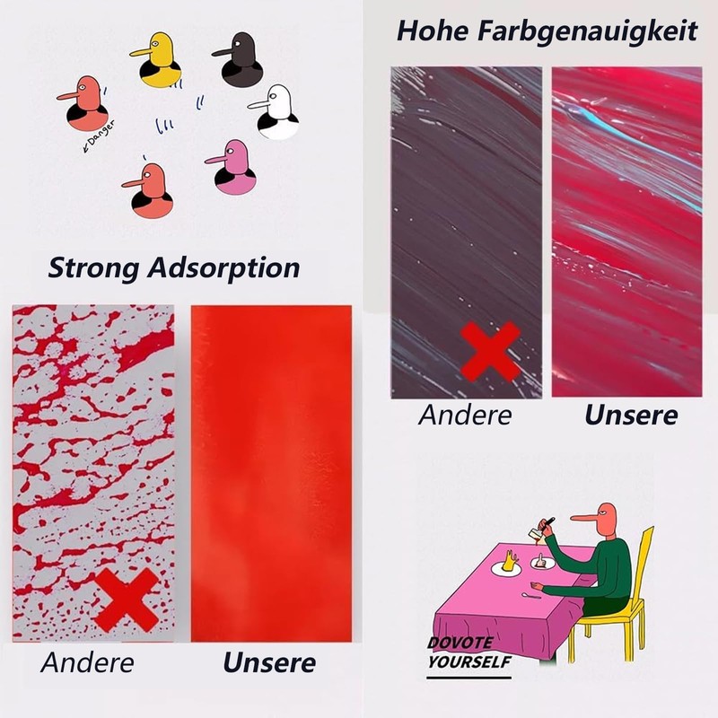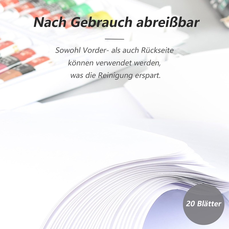 - Easy to use and clean: With our tear-off palette, the tedious cleaning of paint palettes is eliminated. Each side is finished with a special wax coating that prevents colour penetration. After use, simply tear off the used sheet and dispose of - keeping your workspace clean and tidy.