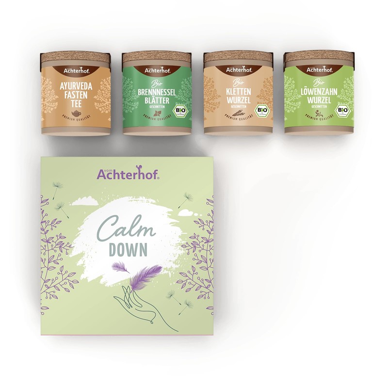 Calm Down Set | with Organic Dandelion Root, Organic Nettle Beds, Ayurveda Fasting Tea & Organic Burdock Root | 4 x Herbs and Teas to Get Down | Gift Box | from Achterhof