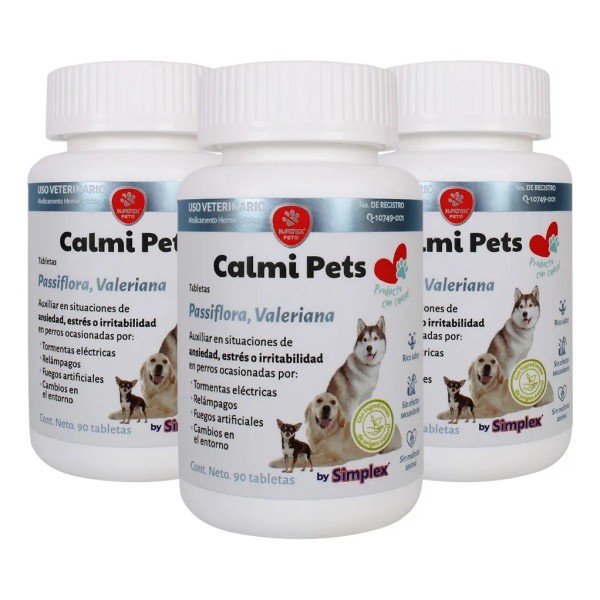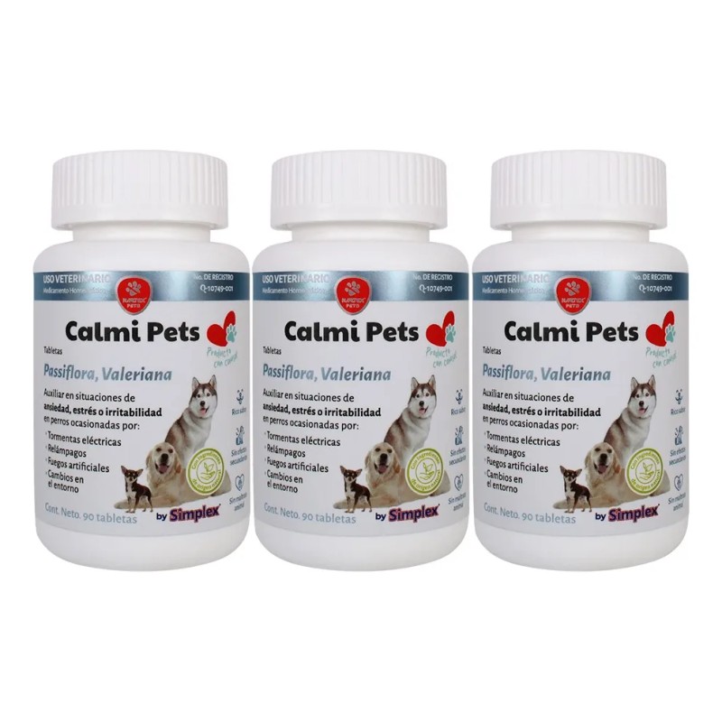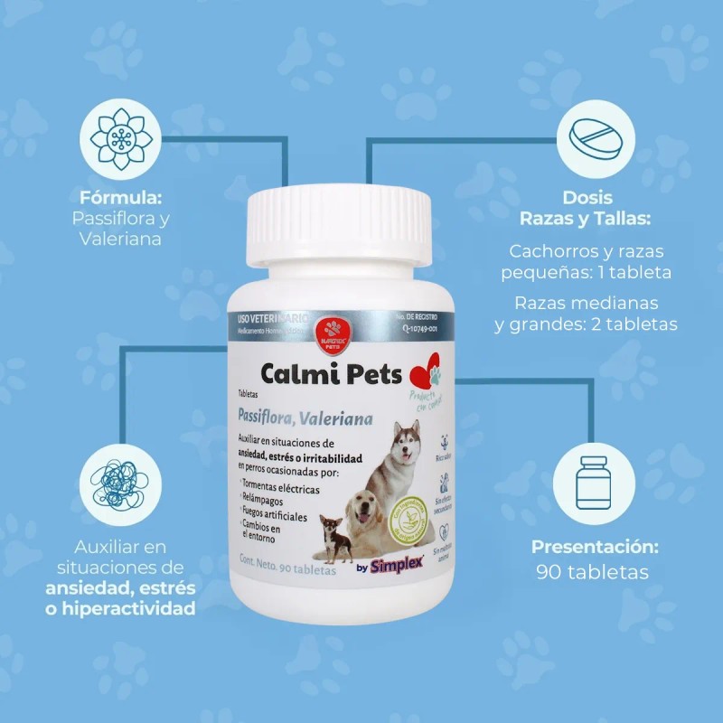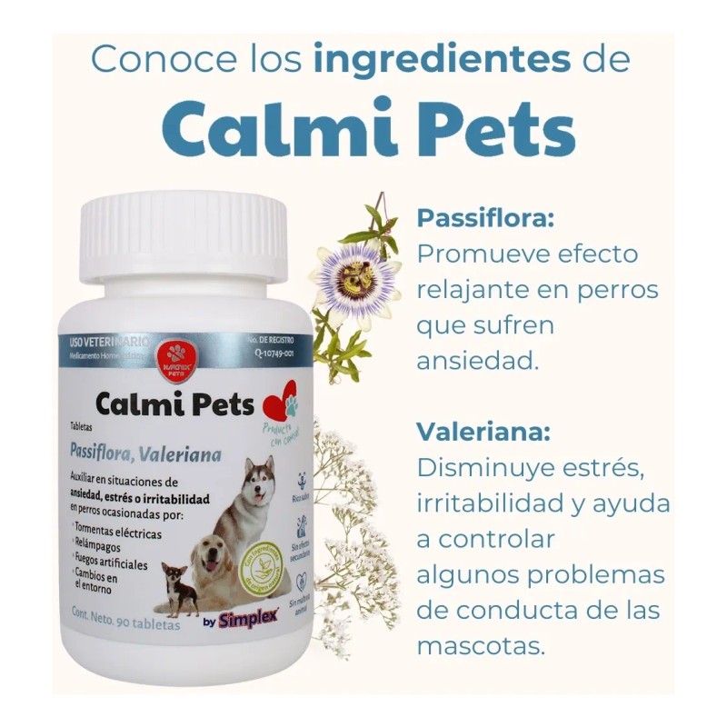 Calmi Pets está formulado con ingredientes 100% naturales como Passiflora y Valeriana, conocidos por sus propiedades tranquilizantes. 🌿 Con su fórmula única, tu perro se sentirá más relajado durante tormentas eléctricas, fuegos artificiales o cualquier cambio en su entorno. ¡Imagina ver a tu compañero más feliz y seguro sin importar la situación!
