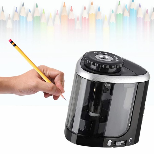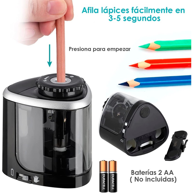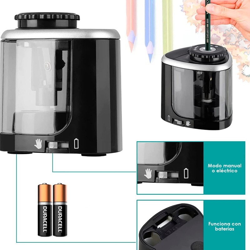 Este sacapuntas con dos modos: automático y manual. Modo eléctrico: use 2 pilas AA (no incluido), presione el lápiz para comenzar a trabajar de manera eficiente y afile automáticamente las puntas del lápiz rápidamente, lo suficiente para afilar fácilmente su lápiz en 3-5 segundos. Cuando la batería está baja, puede cambiar al modo manual.