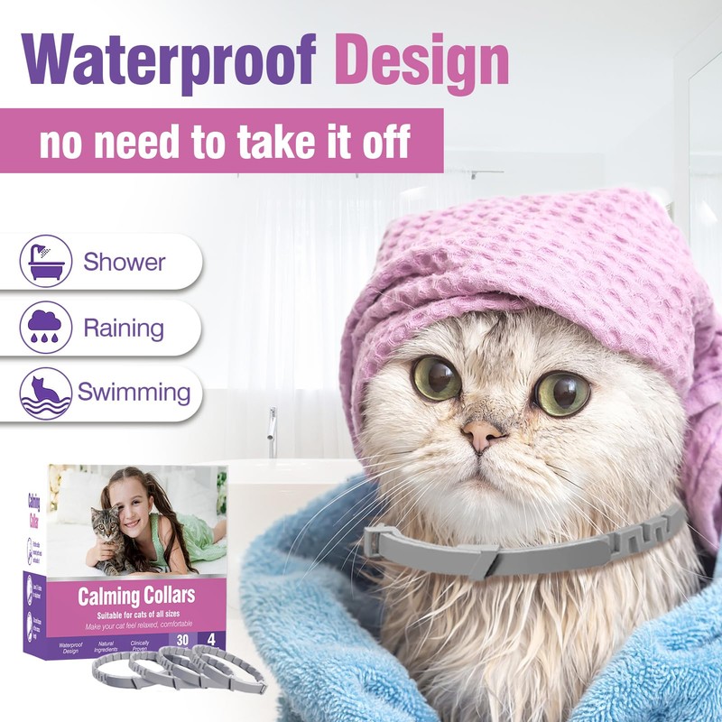 - [Calm Lasts 30 Days] Calming collar for cats providing up to 30 days of sustained pheromone release,cats calming collar ensures high quality and longer-lasting pheromone delivery for your cat. For best results, cat calming collar can be worn continuously. Also, you don't need to worry about taking the calming collar off in the shower or in the rain, because the calming collars for cats is waterproof, the calming cat collars will keep your pet relaxed even in wet conditions