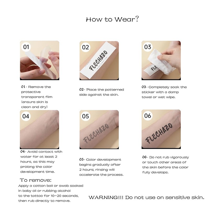 - 【Easy to Apply and Wear】Unlike real tattoos, realistic temporary tattoos do not require any pain. Our temporary tattoos are easy to use. First, clean the skin, apply the design to the skin, then cover it with a damp sponge for 20-30 seconds, peel off the backing paper, and finally achieve a perfect tattoo! They can be easily removed with alcohol or baby oil.