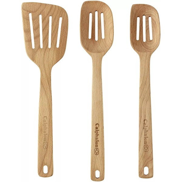 Calphalon 3pc Solid Wood Cooking Utensils Set Slotted Spoons Turner Wooden